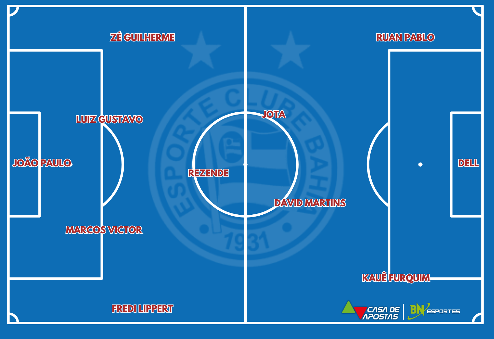 Bahia: João Paulo; Marcos Victor, Fredi, Luiz Gustavo e Zé Guilherme; Rezende, Jota e Pedrinho; Kauê Furquim, Ruan Pablo e Dell. Técnico: Rogério Ceni.