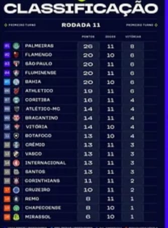 Brasileirão série A : confira classificação completa apos a 11ª rodada