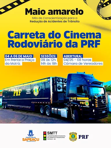 Na parceria da prefeitura com a Pólícia Rodoviária Federal (PRF), o município estará recebendo, nas comemorações da Campanha mundial de prevenção de acidentes do trânsito, do Maio Amarelo, o Cinema Rodoviario.