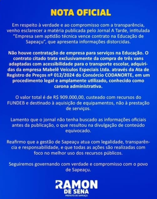 SAPEAÇU: Prefeito emite nota negando contratação de empresa e desmente matéria em coluna de jornal